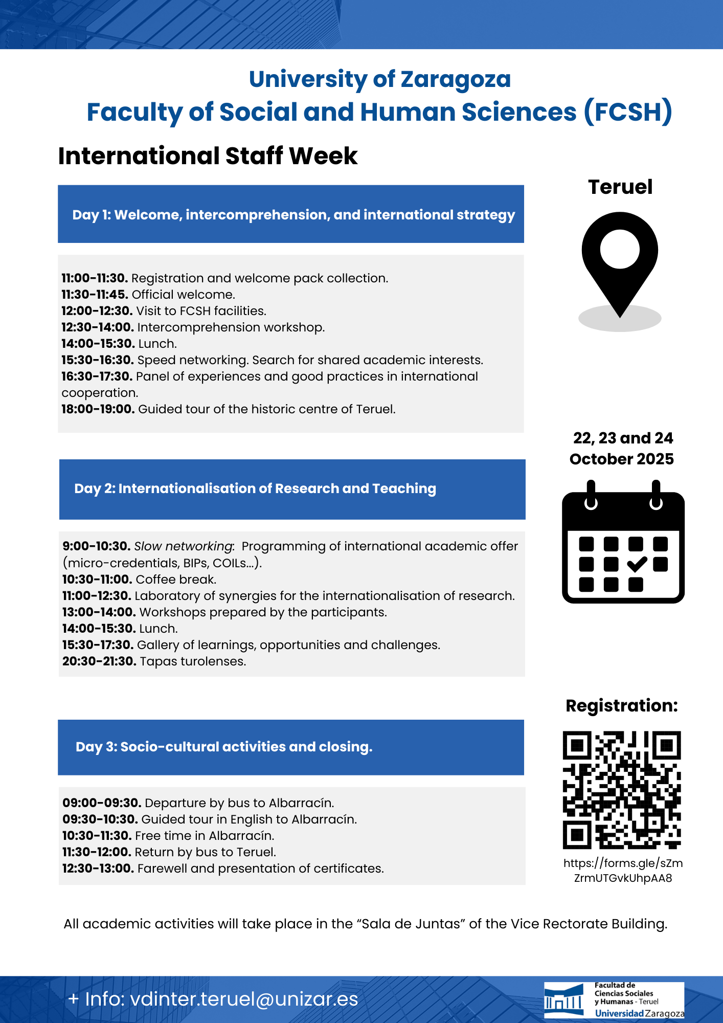 La Facultad de Ciencias Sociales y Humanas (FCSH) de la Universidad de Zaragoza acogerá los días 22, 23 y 24 de octubre de 2025 la International Staff Week, un encuentro destinado a promover la cooperación académica y la internacionalización de la docencia y la investigación.