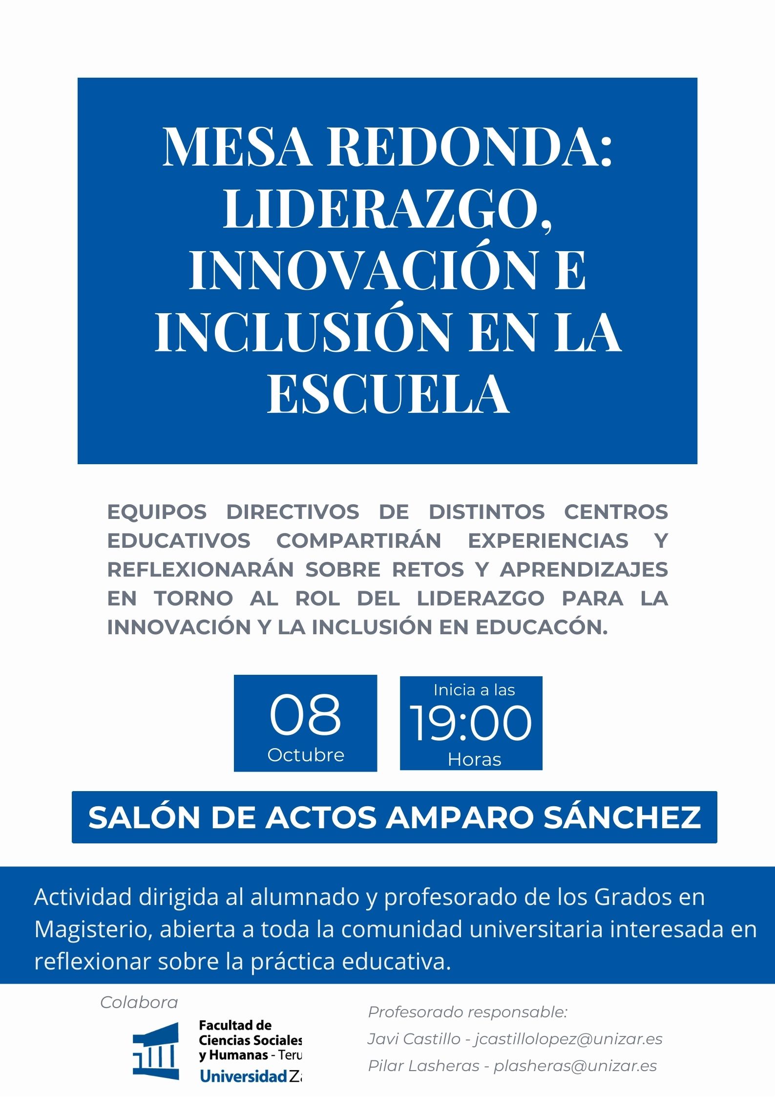 El próximo miércoles 8 de octubre de 2025 tendrá lugar en el salón de actos Amparo Sánchez, ubicado en el edificio de Ciencias Sociales de la Facultad, una mesa redonda con directoras y directores de distintos centros educativos en torno a tres ejes importantes para la educación: liderazgo, innovación e inclusión.